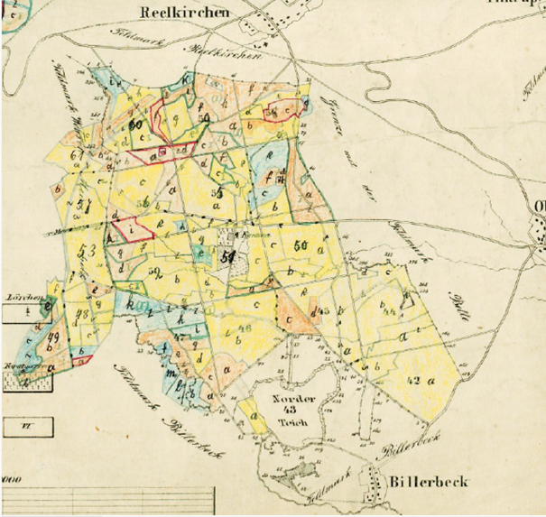 Forstkarte des Beller Holzes (um 1890). Die Farbe zeigt die herrschende Baumart: gelb ist Eiche, braun Rotbuche und blau Fichte. Noch um 1790 waren schätzungsweise mehr als 70% der dargestellten Fläche „ eine Holtzblöße“, der Rest überwiegend junge Anpflanzungen.Karte: Landesverband Lippe/Forstabteilung