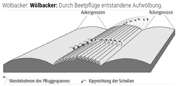 Wölbacker, Hochacker, durch eine spezifische Pflugführung ("Aufackern"; mit Beetpflügen, deren Schar fest eingestellt war und die Scholle nur nach einer Seite, in die Mitte des Feldes, wendete) bedingte Wölbung eines Ackerstücks mit Scheitelhöhen von 30-100 cm ( Abb.). Meist liegen mehrere solcher Äcker parallel zueinander in einem Verbund. Aspekte der Wasserführung und der Risikominderung werden für gewöhnlich als Gründe für die Anlage genannt. Danach hätte in nassen Jahren die erhöhte und damit trockenere Fläche guten Ertrag gebracht, in trockenen Jahren seien die tieferen Furchen ausreichend feucht gewesen, um eine ausreichende Ernte zu erzielen. Rezente Wölbäcker sind heute in Europa als Folge der Technisierung der Landwirtschaft kaum noch zu finden. Landschaftsgeschichtlich sind fossile Wölbäcker sichere Zeugnisse ehemaligen Ackerbaus, allerdings mit unsicherer Zeitstellung (Wüstung).